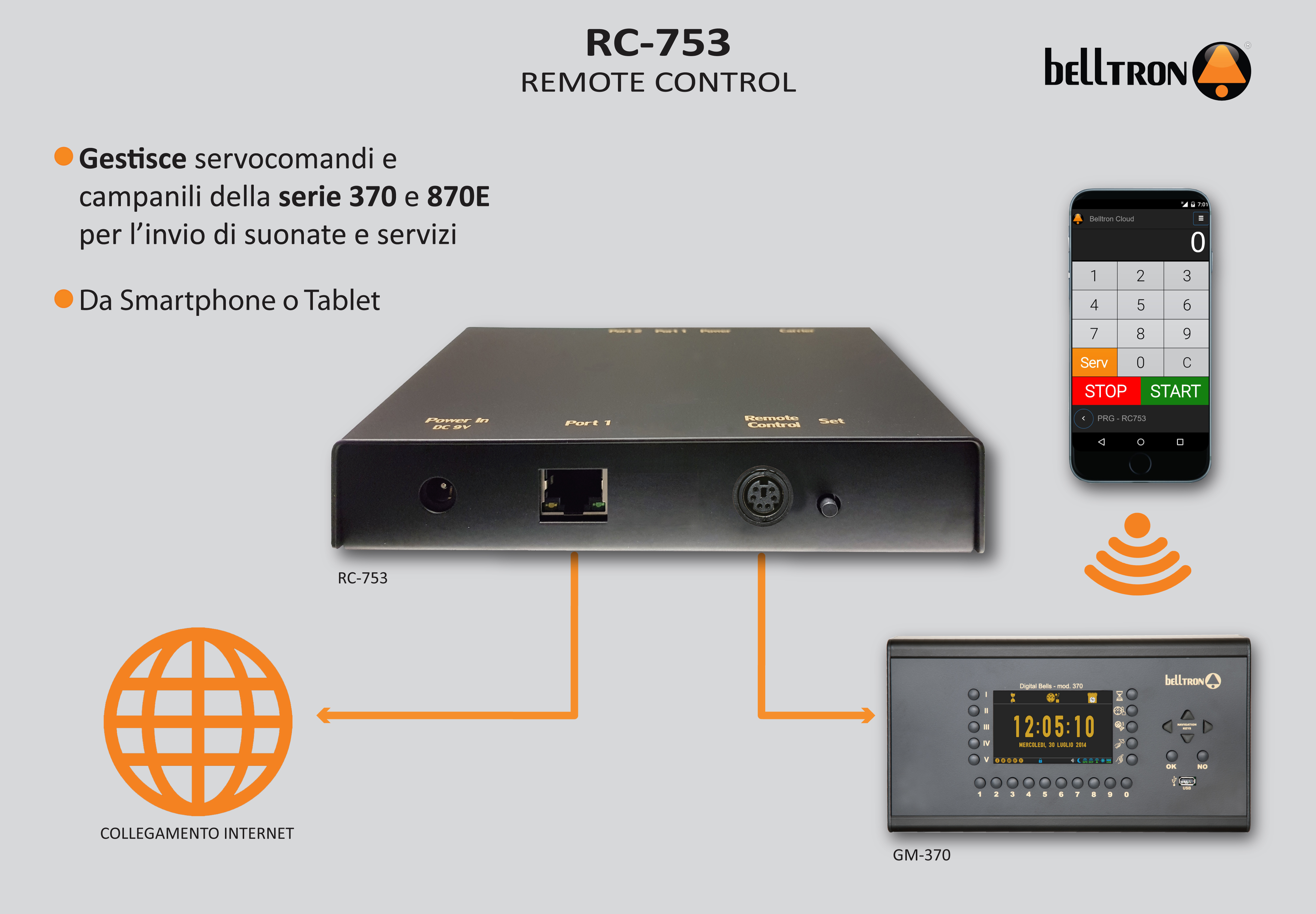 EIN REMOTE CONTROL, DASS DIE SENDUNG DER KLÄNGE UND SERVICES VON SMARTPHONE UND TABLET ERMÖGLICHT. ES IST FÜR ALLE HAUPTUHREN UND ELEKTRONISCHE GLOCKENTÜRME 370 UND 870E.